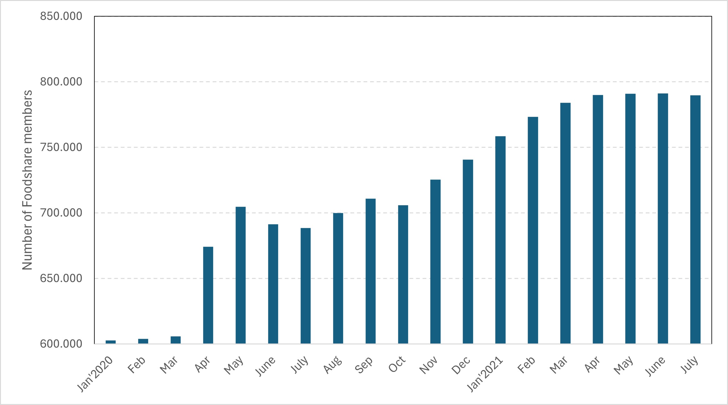 Some immediate responses from the government produced unrest in the population. The initial Wisconsin Supreme Court response was to overturn public health emergency declarations on March 31, 2020, which resulted in thousands of families losing their benefits. These sudden interruptions of benefits increased families’ uncertainty about how they were going to pay for food. However, different organizations such as Foodshare (a major national government program that distributes benefits or food stamps to eligible participants facing hunger and food insecurity) rapidly increased their responses. Official figures show that, as from April 2020, there was a sharp increase in the number of Foodshare members, first-time assistance groups,[1] and total issuance of Foodshare benefits. The number of Wisconsin participants receiving Foodshare benefits increased from about 600,000 members in March 2020 to almost 800,000 members in July 2021 (Wisconsin Department of Health Services) (Figure 1). The number of first-time assistance groups (AGs) more than doubled during the beginning of the pandemic, from ca. 4,000 in February to over 11,000 in April 2020. By July 2021, the numbers had substantially decreased, although were still larger than pre-pandemic figures.