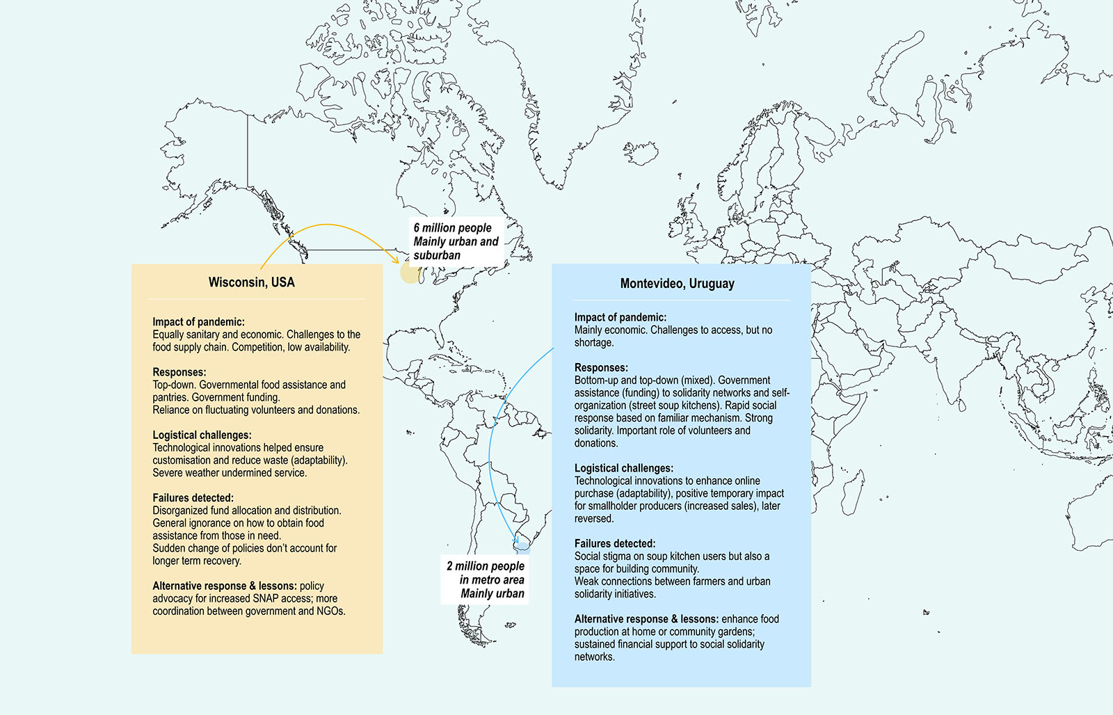 We highlight different response strategies (largely top-down in Wisconsin, and a mix of top-down and bottom-up in Montevideo), discuss some of their successes and failures, compare official and popular narratives, and reflect on potential changes to be made to help shape more resilient local food systems but also to enhance the resilience and dignity of communities facing hunger.