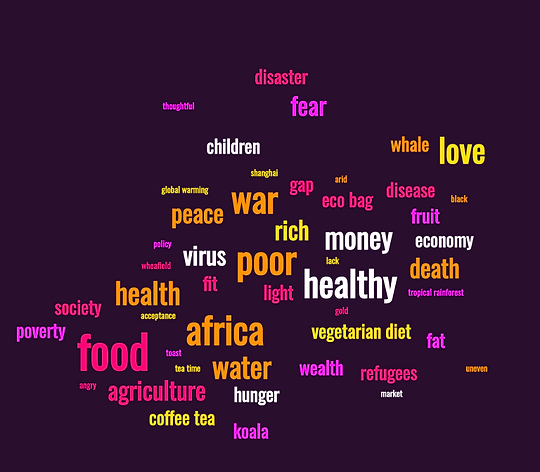With the UN Sustainable Development Goal 2 (UNDP), “Zero Hunger”, as a starting point, I facilitated The Hunger Project in an online classroom. Microsoft Teams served as the main classroom, and the LINE messaging app was used as an additional communication platform. The brainstorming session started with a group word association game: “which words come up when we hear the word ‘hunger’?” The students listed their word associations on a Google Document. Then, I utilized an online word cloud generator to visualize all of the students’ hunger-related ideas.