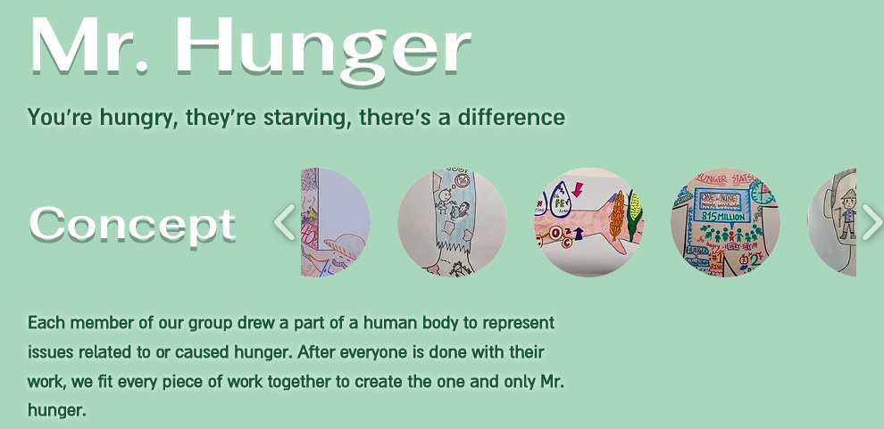 At the same time, The Hunger Project is characterized by an open-endedness and hands-on nature. While the initial research phase was rooted in real-world data, the latter part of the assignment relied on the students’ imagination and interpretation. Within the parameters of the assignment: create any type of art to address hunger, the students had ample room in the formulation of their artworks, whether it be method, material, or mode of presentation. The project also allowed the participants to practice translating their thoughts and observations, presenting pertinent social conditions, and conveying concerns for hunger through art creation. As a result, The Hunger Project pedagogy provided a new pathway to hunger action.