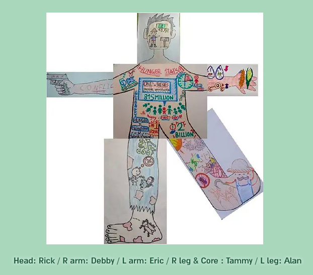 The group calling themselves TOXICREADS took the most literal approach to collaboration. Their Mr. Hunger is a literal collage of the various causes of hunger (see figures 2–5). The message “You're hungry, they're starving, there's a difference” distinguishes hunger as a mild discomfort from extreme hunger suffered by those in severe poverty, famine, and war. Then with additional texts and drawings, each member proceeded to illustrate hunger statistics, war, climate change, poverty, and an unstable market on Mr. Hunger’s head, torso, and limbs. Mapping the myriad and interconnected reasons for starvation and layering them on a “person,” albeit imagined, TOXICREADS brought these dire problems visually to the physical body, and thus closer to home.