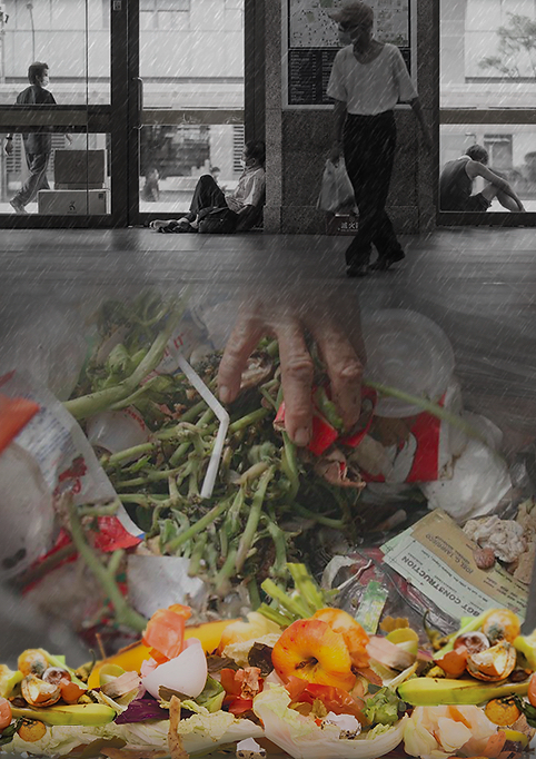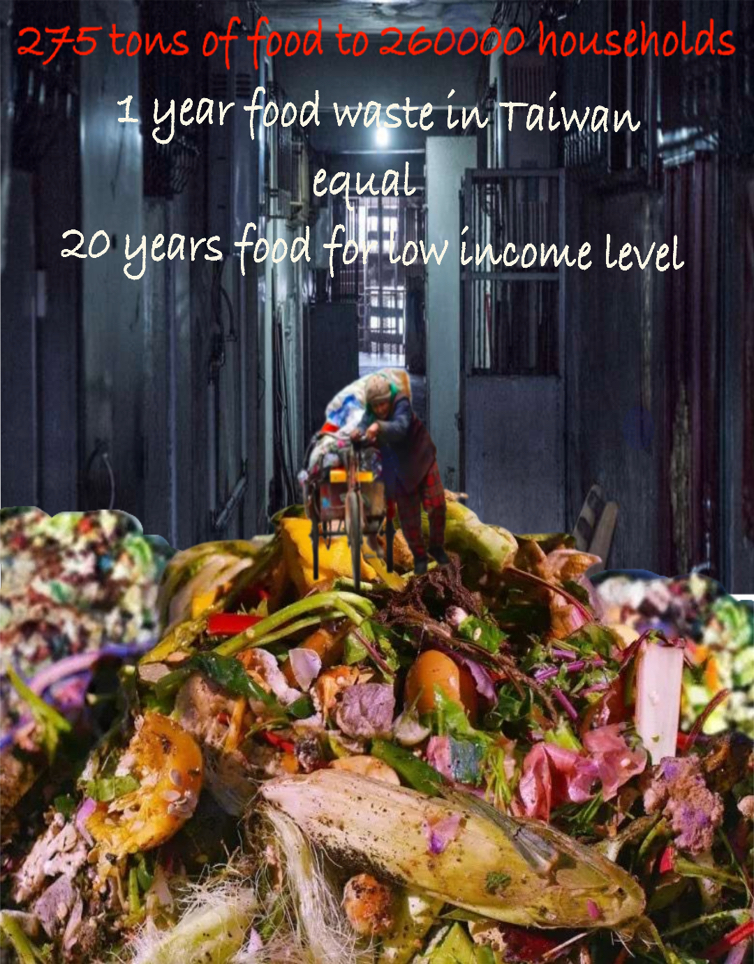 Another group, My Goodness, linked social class with food access and consumption in Taiwan. They displayed the “Taiwan Hunger Map 2020” to inform the viewer that not only Taiwan's southernmost county has the highest density of hunger, but also 1 out of 100 people in Taiwan suffer from starvation. Their artworks comprise four digital collage-portraits of the “characters” and “food types” of the homeless, the low-income, the middle-class, and the rich class. Visually, all four images place the corresponding “food type” in the foreground, the figure(s) in the midground, and the shelter in the background. This similarity in composition creates a sense of unity in the series (figures 6–9). While the style and content of each digital image matched its concept, the ones portraying the homeless and the low-income are the most visually effective. In the “homeless” collage, a weathered hand picks up food scraps while homeless people linger in a lobby. The “lower-income” collage features an older person pushing a tricycle, loaded with either her meager possessions or recycled materials that could be exchanged for a minimal sum. She treads on piles of “ugly food” that also seem discarded. Texts inform the reader: “1 year of food waste in Taiwan equals 20 years of food for low income level” (My Goodness). In both images, the viewers are confronted with the almost overwhelming closeups of food waste and a haunting desperation created by the contrast between the monotone backgrounds and colorful foregrounds.