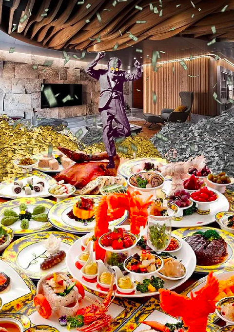 Conceptually, the narratives for the middle class and the rich are less based on scientific data, and more on imagination, or created from observation and association. Noteworthy is the portrayal of the rich: in a spacious, designer-decorated interior, a man throws a bundle of cash in the air and dances with enthusiasm and abandon on mountains of cash and a spread of intricate banquet dishes typical in Taiwan. This narrative and the almost overly saturated colors combine to achieve a sense of theatrical absurdity. The abundant food and cash seem to fill and spill over the visual space, recalling horror vacui. The formal choice of filling the entire space reveals the students' perception of wealthy desires: obsessive acquisition of money and resources, excessive consumption, and unnecessary waste. The saturation of the picture plane underpins the perceived over-the-top, frivolous lifestyle of the wealthy, exemplified by the lavish banquet and the dancing figure. The surplus hoard of cash was so great that the man could afford to throw money around without care. This representation, juxtaposed with collaged images representing the experiences of the homeless and low-income, becomes ironic and farcical: the hunger of the homeless and the low income is physical, whereas the hunger of the wealthy is insatiable greed.