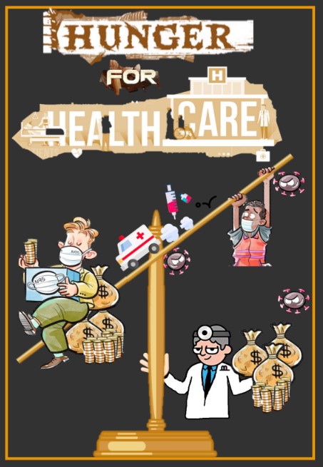 TPELOVECGK also examined the COVID-19 pandemic in relation to the hunger for being healthy, as well as healthcare disparities. Their poster, an assemblage of found digital illustrations, depicts an oversized scale held by a doctor and “a rich man and a poor guy” on either side (figure 10). The rich man, surrounded by bags of cash and piles of golden coins, sits comfortably on and weighs down his end of the scale. Whereas the “poor guy”, attacked by the coronavirus, tries in vain to tip the scale back in balance and watches the ambulance and vaccine race toward the rich man. The group writes, “A rich man gets more vaccines and resources by his wealth and power, on the other hand, poor guys have nothing.” Drawing from numerous news reports, including data from the World Bank and WHO, TPELOVECGK pointed out the plight of those suffering poverty and a lack of access to essential healthcare. Their research not only indicated a health gap between the rich and poor, but also a widening economic gap due to the COVID-19 pandemic, in which healthcare expenses pushed more to extreme poverty (TPELOVECGK). Thus, a cycle of deficit in health and wealth perpetuates.