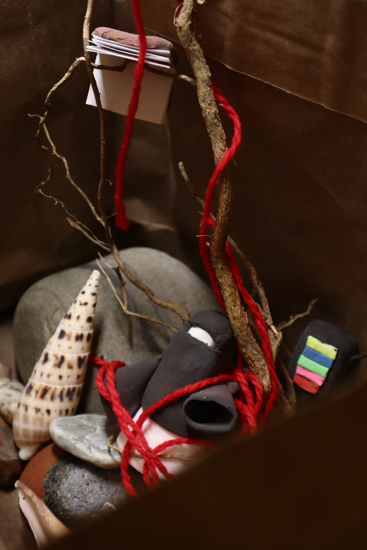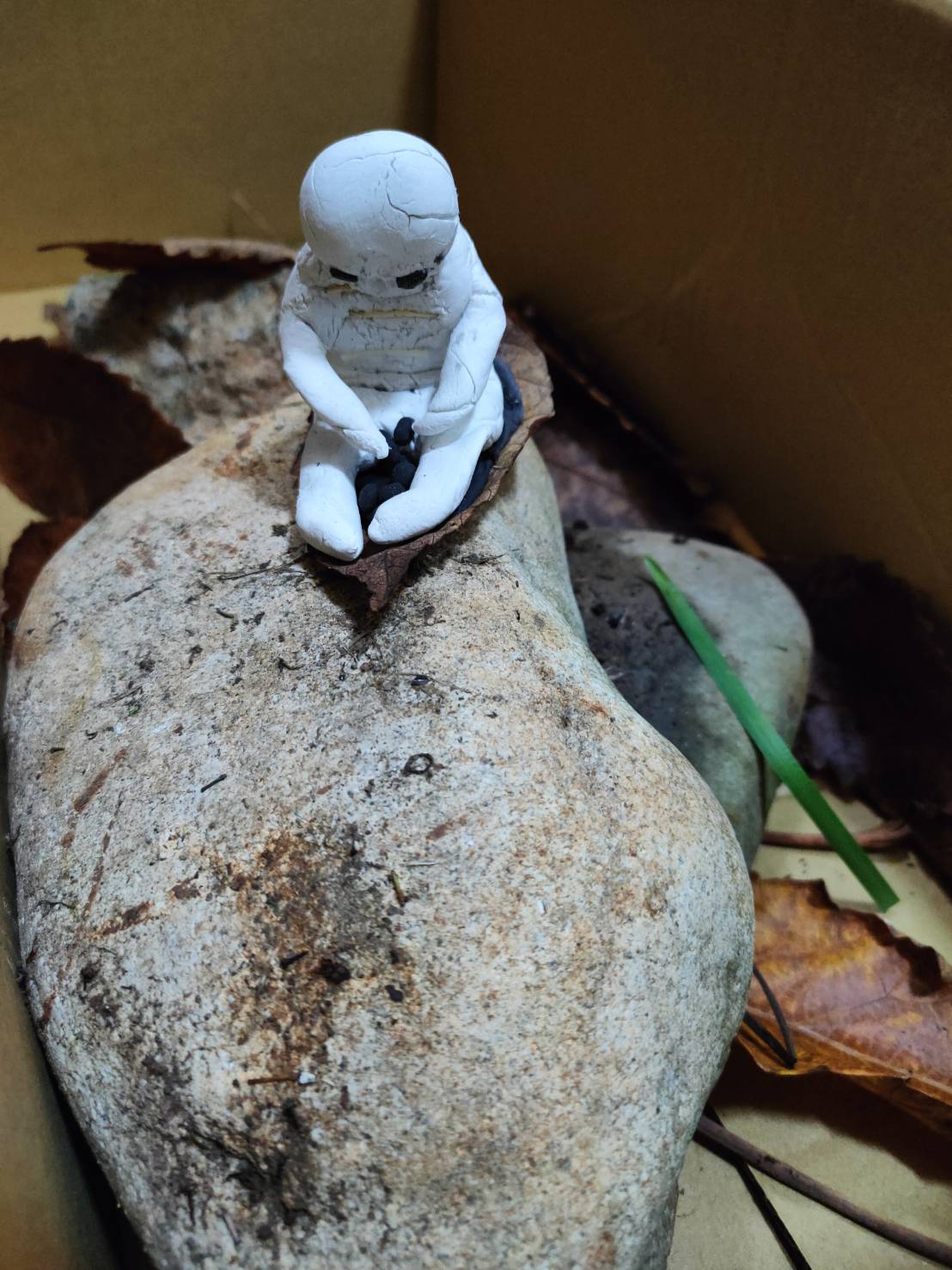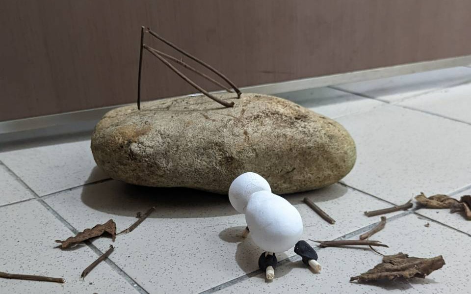 In addition to physical hunger, the group Babysitter also showcased the emotional hunger for love, the spiritual hunger for a supreme being, and the hunger for knowledge in the mind. They created miniature scenes with manmade and natural materials found on their desks and in the garden of their dormitory (figures 11–14). Each of the four mini sculpture installations, situated at the corners of a cardboard box, displays a white paper clay figure suffering from a type of hunger. In the emotional hunger scene, an unbecoming figure with a red “X” across his face holds a heart in one hand and a rose on the other (figure 11). This vignette visualizes the inability of “an ugly person”, as the group puts it, to find love and acceptance due to the world's superficialness. In the spiritual hunger scene, the figure bows to an abstract construction on a big rock. This set comments on the “blind fabrication” of a transcendent existence “when life becomes difficult and desires cannot be satisfied,” which could either “help people get through difficult times” or “backfire” (figure 12). Of the four vignettes, the greatest visual contrast can be found between “mental hunger” and “physical hunger”. While the mental hunger scene is almost saturated with various types of lines, colors, forms, and materials, the physical hunger scene's surroundings are stark and barren. This barrenness corresponds with the hunched, hollowed-eyed, famished figure on a piece of dried, brown leaf atop an elongated rock (figure 13). Three thin bamboo sticks are pressed into this figure's chest to express thinness to the bones. And in the desperation of hunger, this figure picks up unappetizing, black bits of food.