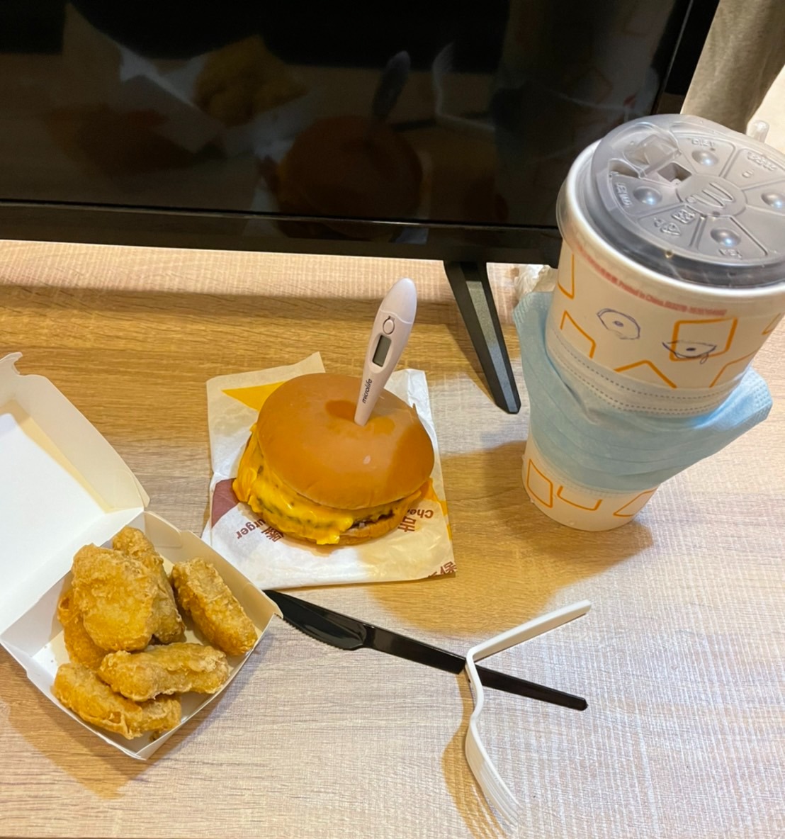 Another member of the group Fun Jin Chee, a Kazakh exchange student, combined a McDonalds Happy Meal with found objects to show the involuntary fasting due to food shortage in Shanghai (figure 15). Connecting the ideas of fast food and fasting, he jabbed a thermometer into the hamburger. The unnatural juxtaposition of the inedible instrument and the hamburger is jarring. This may refer to the intrusive, inconvenient yet preemptive government policy of measuring people’s body temperature upon entry to shops, school, and other public buildings, which became part of Taiwan’s daily life to prevent an island-wide COVID-19 outbreak after April 1, 2020. Beside the hamburger on the soft drink cup, a pencil-drawn frowning face with a drop of tear at the corner of an eye wears a real mask, another object ubiquitous during the pandemic. The iconography of fast food items and their personification bring to mind fast food and delivery workers in Taiwan. The pandemic worsened the working conditions of these precarious couriers, along with mask production line workers and taxi drivers. As the general population went into quarantine in the safe confines of their homes, the need for food and goods delivery increased all of a sudden, resulting in delivery workers going into overdrive. At the same time, in order to meet the expectant hiking demands of masks and maintain their affordability, Taiwan’s Ministry of Economic Affairs implemented emergency measures and requested domestic mask manufacturers to increase mask production to nearly ten times the pre-pandemic output within three months. As a result, mask production line and delivery workers relayed night and day during the Lunar New Year Holidays, taking 12-hours shifts for seven consecutive days at a time. Even teams of military reservists formed production lines to help (Leua, 38, 40–41; Huang and Chen).