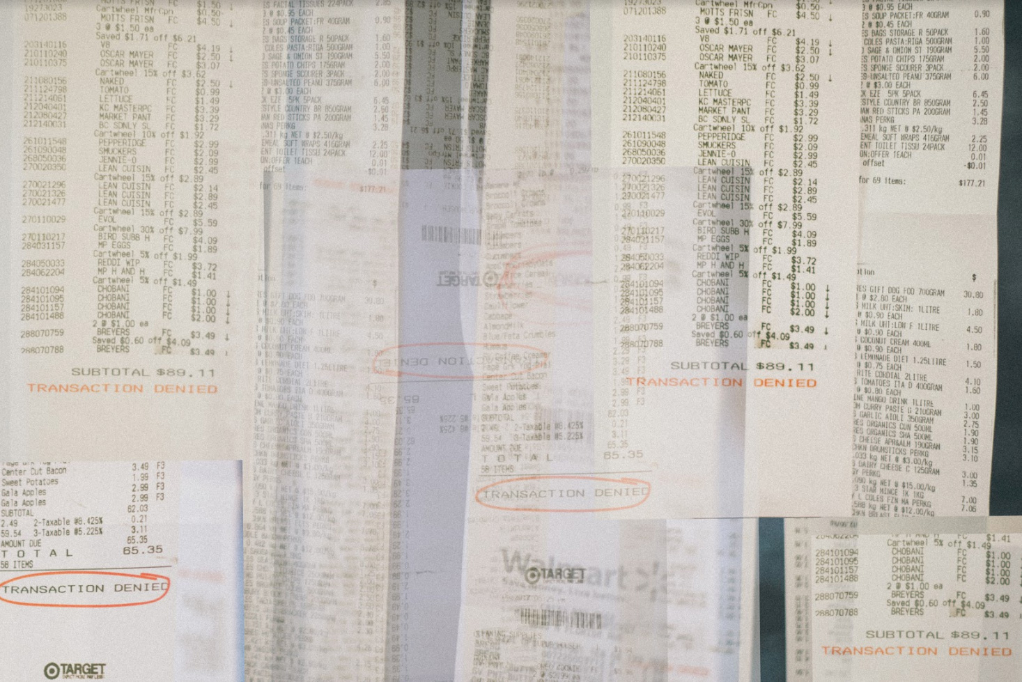 Transaction Denied (2019), an installation created by artists, designers, and community organizers Xena Ni and Mollie Ruskin, exposes the violent constrictions that external hegemonic power systems impose on individuals living with food insecurity. The work, which displays a multitude of grocery receipts marked “transaction denied,” indexes moments in time when individuals were unable to redeem the food in their shopping carts because their benefits were denied due to a technical glitch associated with their SNAP cards. The installation evokes the affective dimension of these instances—the pain, shame, and sense of destitution—through audio recordings of individual narratives that can be heard by picking up a phone receiver. Their artwork subverts the lack and the widely experienced social need by turning it into a spectacle of excess. By walking through the labyrinths of receipts while listening to the endless loops of personal stories, visitors are confronted with the multitudes who are in need of care. The institutionally generated inequities of food distribution and the cumulative, daily trauma of hunger and cyclic poverty are invoked in this powerful work.