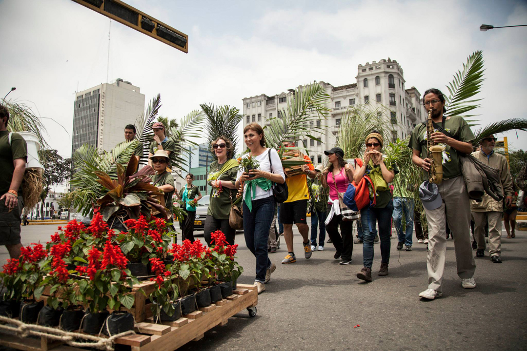 Plantón Móvil started in 2010 while I was walking around Lima, my hometown, and noticing how many trees and plants had their leaves blackened with smog, were being treated as trash cans, or even used as bathrooms. I started to put myself in their place, and thought I would have left town a long time ago. Instead, they are sort of forced to sit there and accept this abuse because of their planted, “immobile,” state. I wondered what it would be like to encounter a walking forest that had taken to the streets like any other group of people would do, demanding respect.
