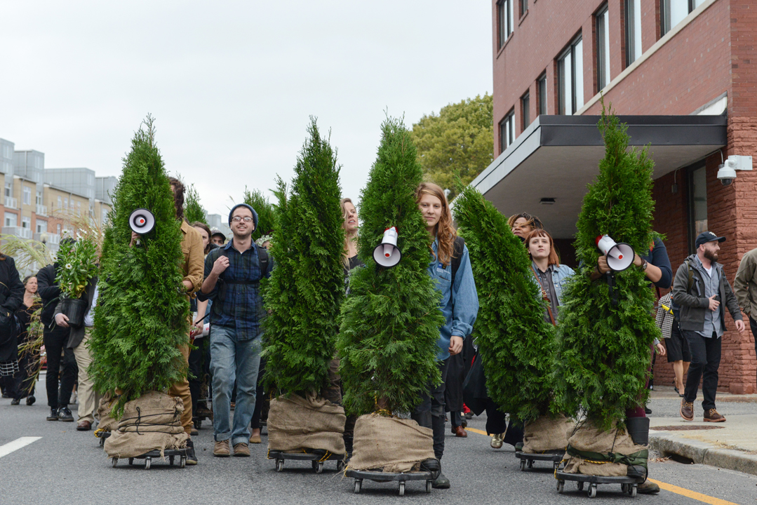 Throughout the years, Plantón Móvil has been referred to by participants and observers as a “plant protest,” a “procession,” and a “parade.” I encourage these multiple readings of the same action because shared ownership necessarily allows for each of us to experience it differently. As we move together, all three conceptions are in fact present: the walking forest offers opportunities for political expressions of ally-ship, of poetic symbolism, and of celebration.
