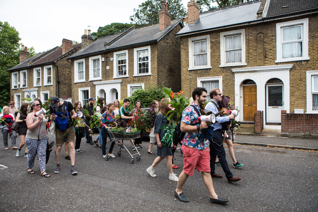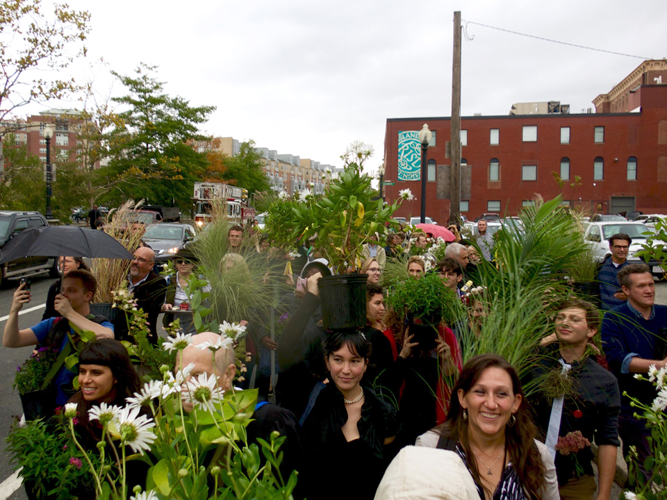 At the end of each walk, the plants are planted in public space. These green areas aim to become places where people nurture community values and include the plants as living neighbors. They are a document of the action, and continue to tell the story of the walking forest even after it has returned to apparent stillness.