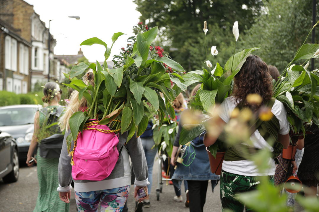 The project does not intend to perform plant movement per se but to move-with as a form of solidarity. This is a walking forest composed of plants and people intertwined in various ways, and how we physically connect ourselves is key. Participants experiment, design, and improvise with all manner of materials including straps, elastic or fabric, backpacks, helmets, bikes, wheelchairs, skateboards, shopping carts, and other unpredictable wheeled objects and wearables.