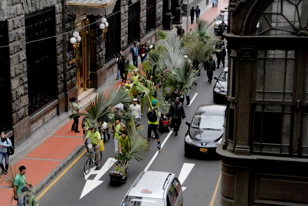Furthermore, climate change’s most popular examples present scenarios of overwhelming scale in a nature made abstract and located elsewhere. To practice in the city aligns with the need to de-capitalize nature in a similar way to what Timothy Morton argues for in The Ecological Thought. He laments the notion of Nature “as a reified thing in the distance, under the sidewalk, on the other side where the grass is always greener, preferably in the mountains, in the wild” (Morton 3). Plantón Móvil takes place in the city to serve as point of contact with issues that may seem to be happening elsewhere. It is not only about opposing to rainforest deforestation but taking responsibility on a daily basis, by being respectful and aware of the “green” that cohabits with us.