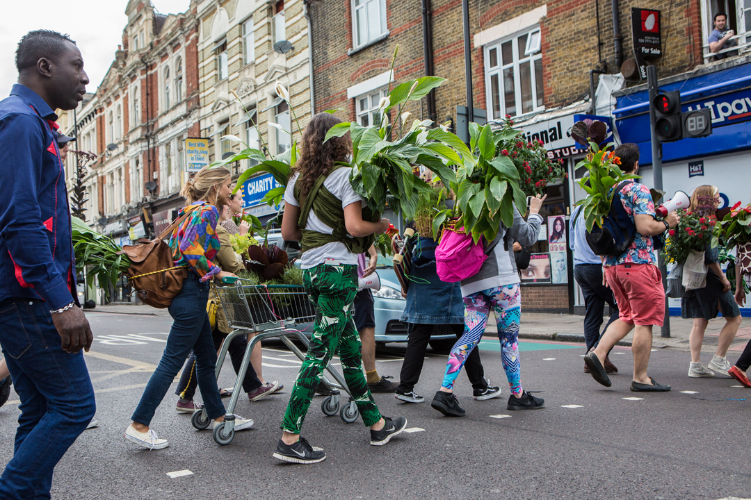 People of all ages, disciplines, and backgrounds are invited to participate. They are prompted to think of a creative way to move with a plant. Some people bring their own plant with them, and others move with the plants that will then live in public space.