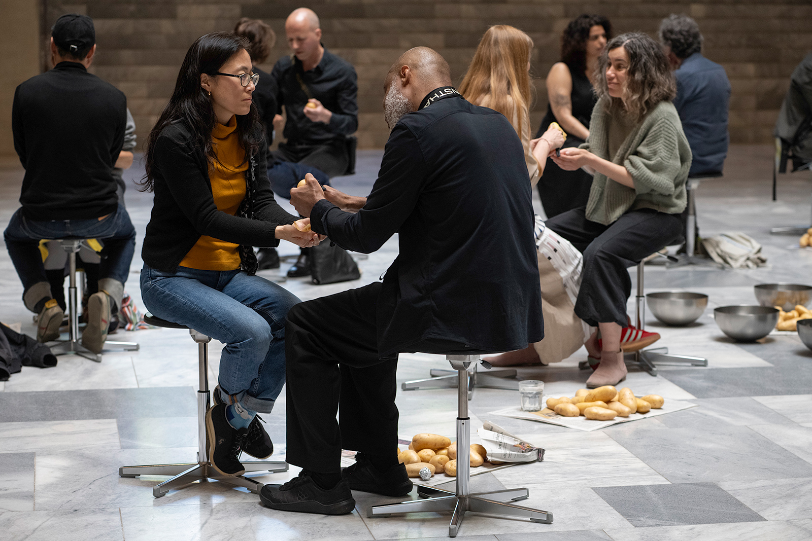 Potato Talks: All the ways we shield, all the ways we reveal, live-art performance, Kunsthaus Zurich, 2025. Photo by Caroline Minjolle.