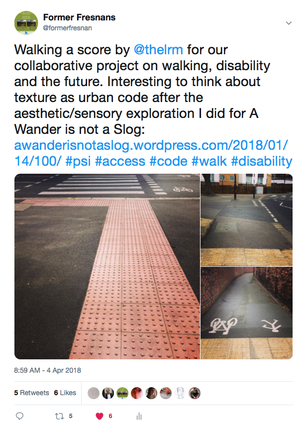 I love the image of you tracing Massey’s marginalia, and the idea of picking up new visions at the bookshop. It was great to actually walk with you, which though we always see each other at walking events, I don’t think we’d had the chance to really do. It made it really clear the different embodied experience you bring to psychogeography, which is so often dominated by the experiences of able-bodied men (myself included!).