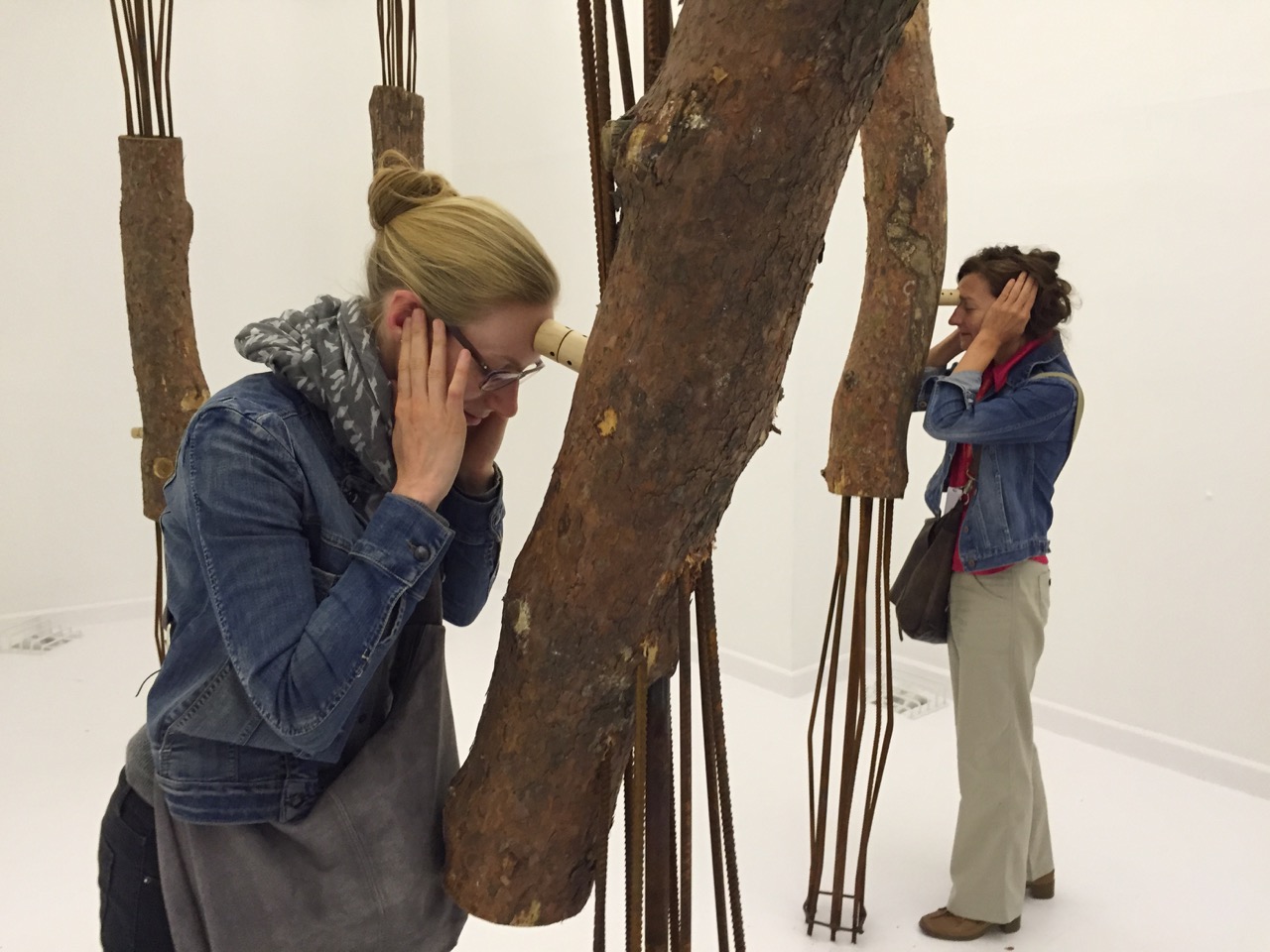 The forest is literal: visitors to the gallery space encounter a sparse grove, or perhaps graveyard, of once-living trees, all reduced to logs. Several feet long, the logs hang lengthwise from a rhomboid metal grille of obtuse and acute angles. This structure is not a standardized architectural grid but a more haphazard canopy of irregular diamonds and triangles. Each log contains a ravel of metal rods that have been bored through the length of its trunk, extending vertically above like naked poplar branches and below like tentacular roots. Some logs are skewered at an angle, pierced through bark rather than through pith and sapwood.