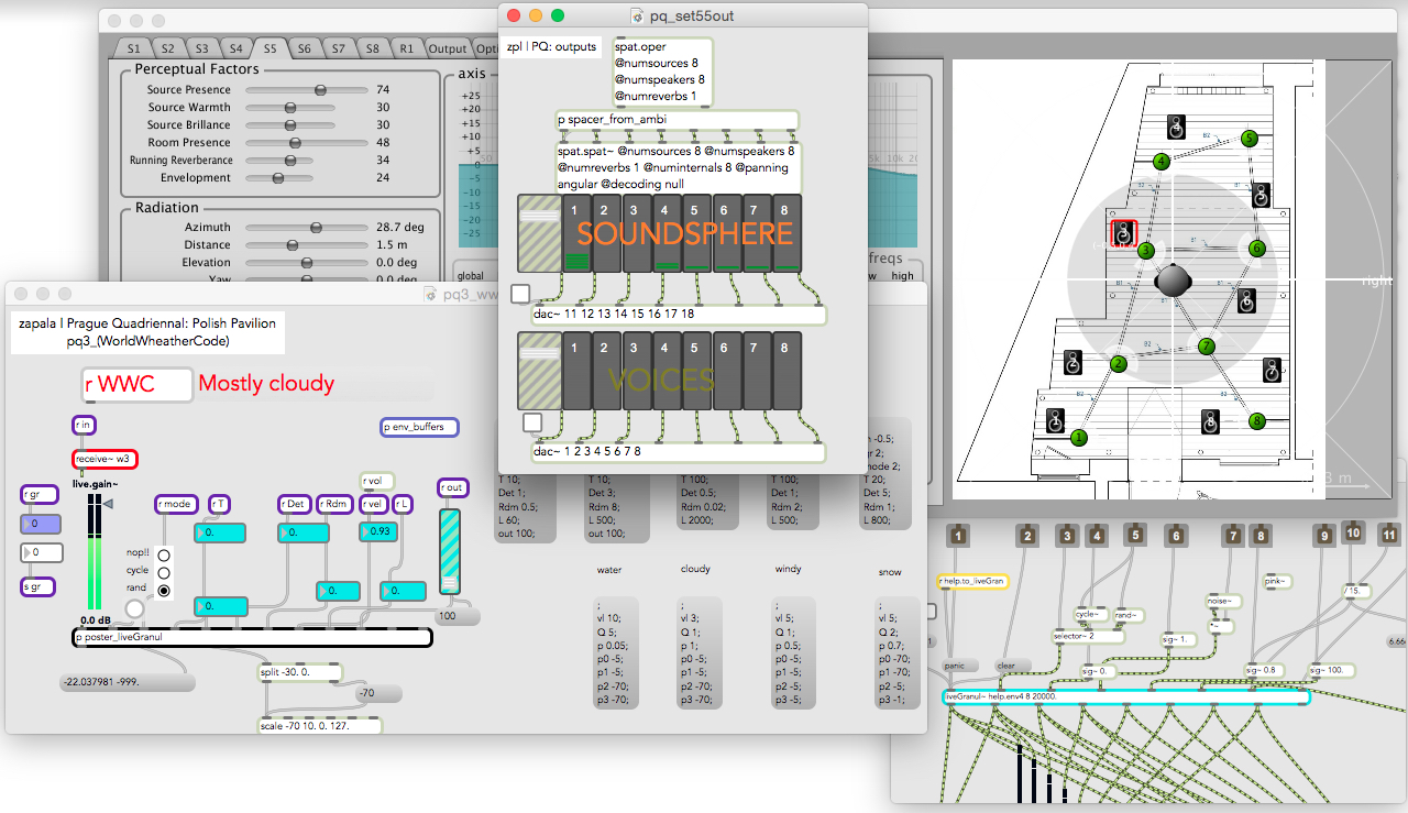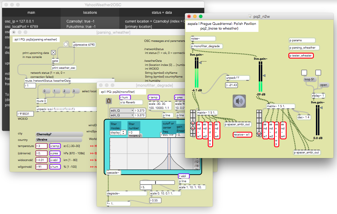 The extent to which the various elements of Post-Apocalypsis constitute description varies. If description, as Marcus, Love, and Best argue, “can take many forms, including lists, case studies, sequences, taxonomies, typologies, genealogies, and prevalence studies,” and if it “involves many actions, including observing, measuring, comparing, particularizing, generalizing, and classifying, using words, images, and numbers,” then the aspect of Post-Apocalypsis that is most assimilable to a descriptive framework is its atmospheric sound installation, which gathers and inscribes meteorological data (Marcus, et al. 2). Visitors to the gallery space enter what theatre scholar Agnieszka Jelewska — the director of the Center and the curator of the Polish national exhibition that presented Post-Apocalypsis — calls an “audiosphere,” an immersive soundscape that takes weather data as the basis of its composition (Jelewska). The installation scrapes data on temperature, humidity, wind speed, and air pressure from sites that have hosted major crises of, or debates over, nuclear energy: Chernobyl, Ukraine; Fukushima, Japan; Dauphin County, Pennsylvania; Nuuk, Greenland; Astana, Kazakhstan; Los Alamos, United States; Żarnowiec, Poland; Kent, Great Britain; Hubei, China; Sochi, Russia; and Crimea, Ukraine. Custom software written in the programming language MaxMSP translates the data into sound, allowing Post-Apocalypsis to incorporate eleven far-flung nuclear hotspots into the immediate sensory space of the installation.
