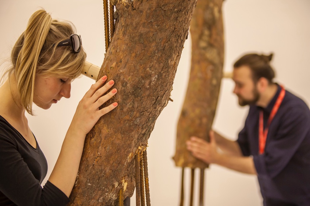 The striking visual elements of Post-Apocalypsis complement its ambitious sonic elements. The metal rods transmit sound, so when visitors press their bodies against the trees, they hear poetry. Instead of passing through the air as most sound does, the recordings carve a more intimate, or even invasive, path through the body to the inner ear. Not unlike the deadened trees, the visitors themselves become physical conduits for poetic expression. Excerpting the work of Polish Romantics Adam Mickiewicz (1798-1855), Juliusz Słowacki (1809-1849), and Cyprian Kamil Norwid (1821-1883), the poems are uttered in English by a young woman. She recites the poems slowly and haltingly, but the recording is textured with static and glitches, making it impossible to know whether the distortion is the result of human affectation, disordered speech, or digital processing. Either way, visitors must listen closely: her words are distorted in quality and jarring in delivery, and they compete with a raucous soundscape that fills the whole gallery space with amplified whizzes, whips, and whirrs. Live streams of weather data — drawn from eleven sites of nuclear conflict — are fed through a custom software program that translates the data into an abrasive score. Played in real time, the soundscape continuously reflects minute environmental fluctuations at each location. Visitors are invited interact with tablet screens to switch between the dissonant nuclear sites, as if tuning to different radio stations.