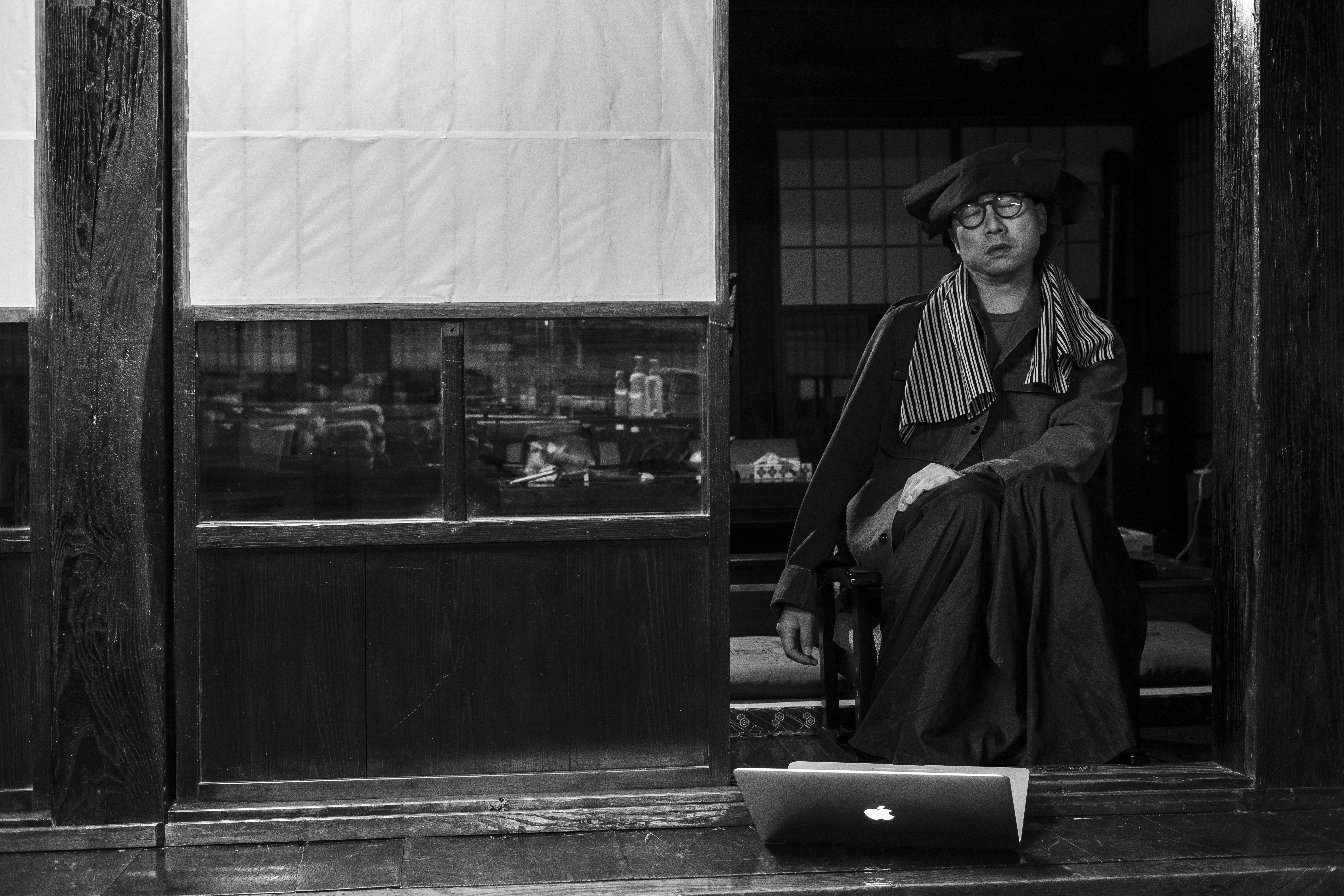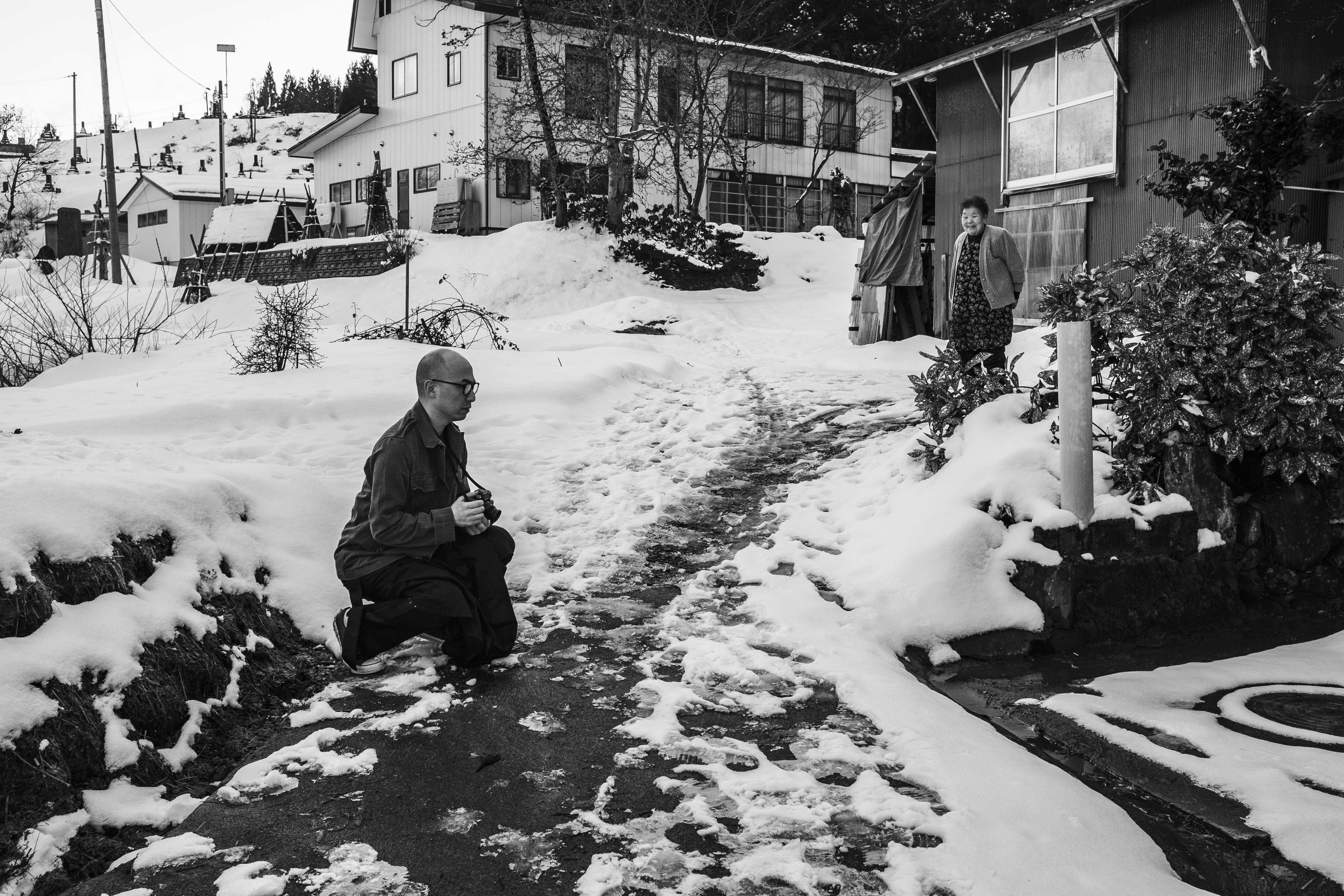 The most precious of my encounters is Shibata-san, who appears in a Kamaitachi photo in the background next to her house as Hijikata monkeys around on a straw mat for a group of children. We drive up to her house, and Yuta explains the project to her. I ask if she would be willing to be in my version of the photo, to help me recreate and reimagine the image. A bit shy, Shibata-san nevertheless agrees. She stands in the background in the same place as before, on the path to her tool shed, while I squat with a camera in hand, reading glasses on, in the place of the children, staring as they did, at Hijikata’s ghost.