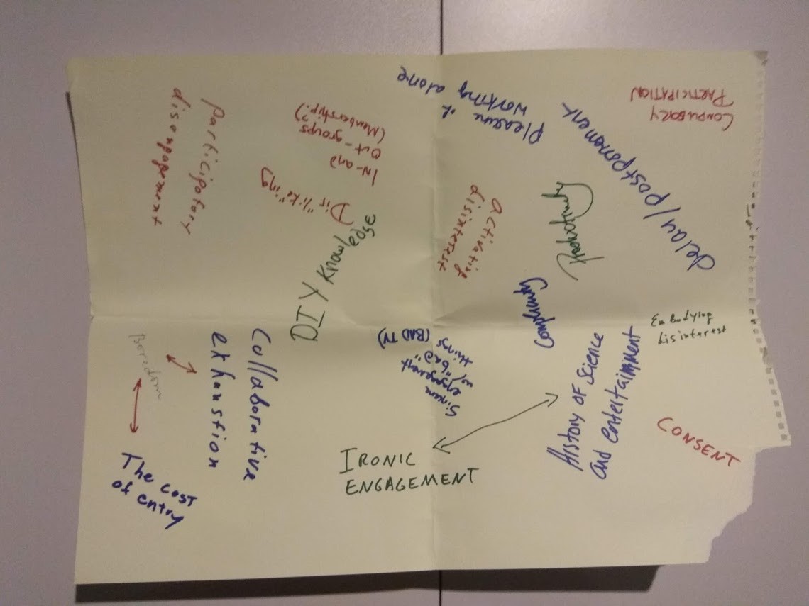 Returning to the beginning: ElastiCity grew out of in-person meetings and discussions as part of the Performance Studies international annual conference in 2018 in Daegu, Korea. Many of us were part of the PSi Summer School, organized by the Future Advisory Board of PSi. In initial discussions of shared research interests, we came together around a variety of concepts related to pleasure, wonder, and performance: boredom and apathy, labour and the maintenance of joy, refusal to perform or engage, fantasy and play (as well as the disillusionment that follows when such spaces are broken) and the intersections of magic and late capitalism. In discussing these ideas (or themes), we found a common object in theme parks and began accumulating ideas for a collaboration to take place in Calgary over Google Docs. Inevitably, the idea was floated: What if we just built our own theme park?