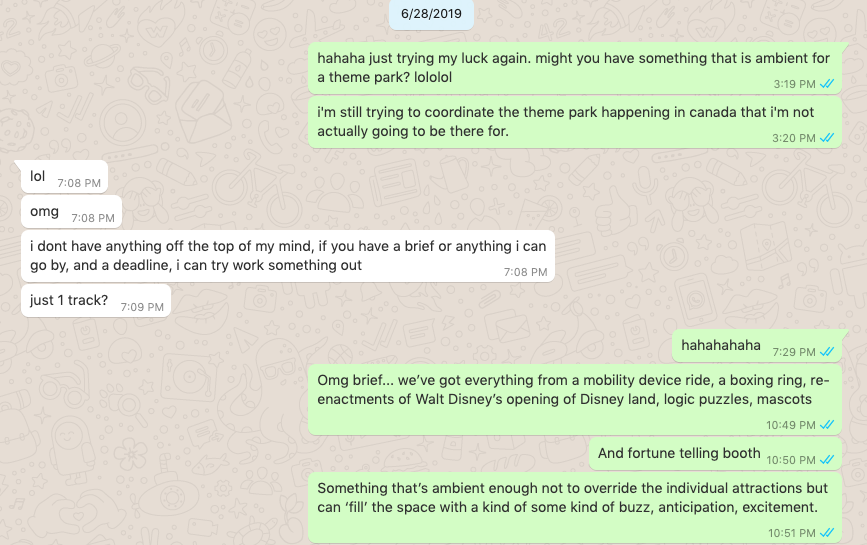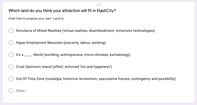 Combined, then, these fragments frame my orientation to theme parks: vertiginous displacement. It didn’t seem surprising then when fate conspired once more in 2019 to keep me from attending ElastiCity at PSi. After months of planning, collaborating, and devising ElastiCity, the theme park eluded me. Still, the conversation continued on, and I continued to coordinate remotely, participating virtually through messaging platforms, human proxies, and digital avatars. Arguably, as organisers, developers, and designers of the theme park, we could never really attend it with the same presence of our immersants.