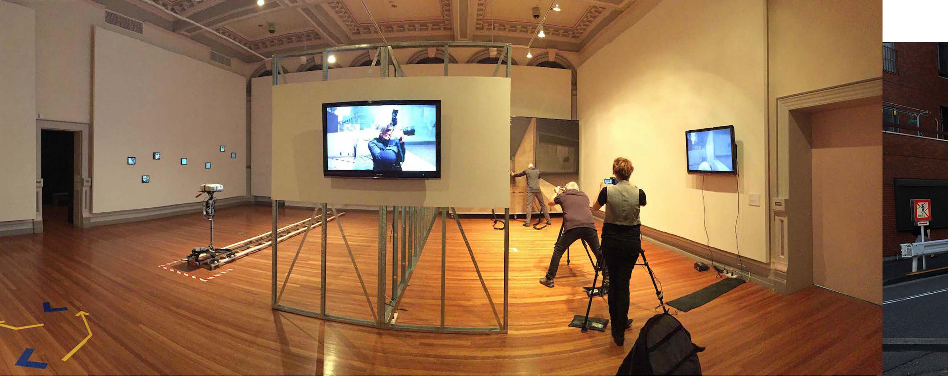 The collaborative artwork PAN & ZOOM has two distinct components that, together, interrogate the relationships between mobile media practices, aesthetics, and performances afforded through such media. PAN & ZOOM reflects and responds to cinematic references, historical photographic techniques, and new emerging entanglements of hybrid, low-tech, and high-tech assemblages of media and representation. While “mobile” media broadly encompasses audio-visual documentation, Internet enabled or interconnected systems, static and/or moving images, we focused on the aesthetic aspects that are widely practiced by users and consumers of mobile media. That is, the cinematic, photographic, and hybrid assemblages of media platforms and presentations. In this way, our artwork operates across and carves out distinctive spatio-temporal re-presentations of media that distort, skew, and, at times, unsettle the relationships between the participant and the artwork.