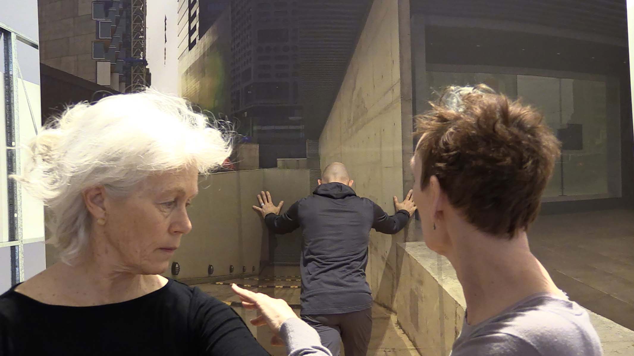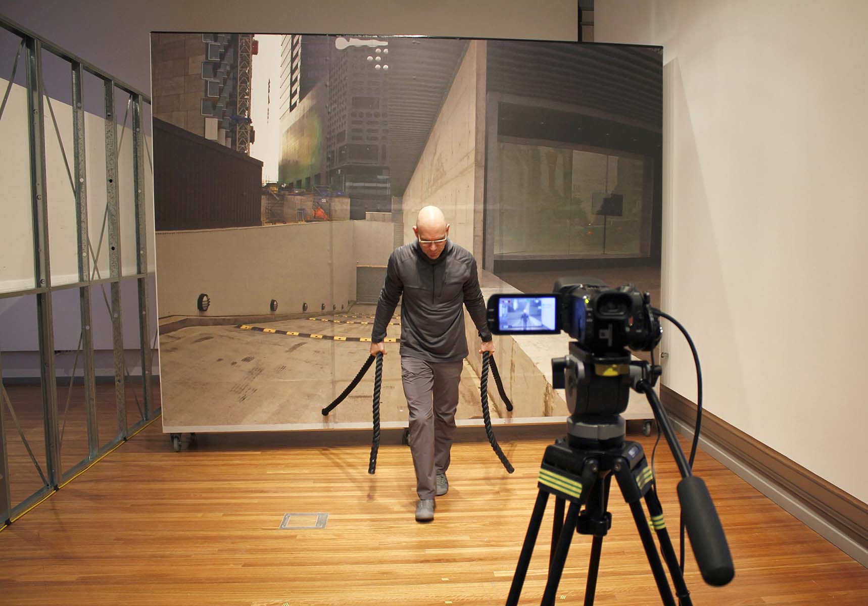 In ZOOM, the “dolly-zoom” effect from cinema, developed by Alfred Hitchcock in Vertigo, was used to create an amplification of spatial perceptions and movement. The effect works by zooming the camera in while physically moving the camera backwards, or zooming out while moving the camera inwards. ZOOM reversed this relationship to intensify the experience for participants, who placed themselves in front of the camera. Instead of the camera physically moving (on a dolly track), the architectural elements of the “stage” moved: the backdrop wall was physically moved by Jondi Keane as the camera zoomed in or out. The result is a disorienting situation where the participants stand in front of the camera, watching their own movements and zoom effect on a live feed TV screen, and performing their reaction to this distortion of space.