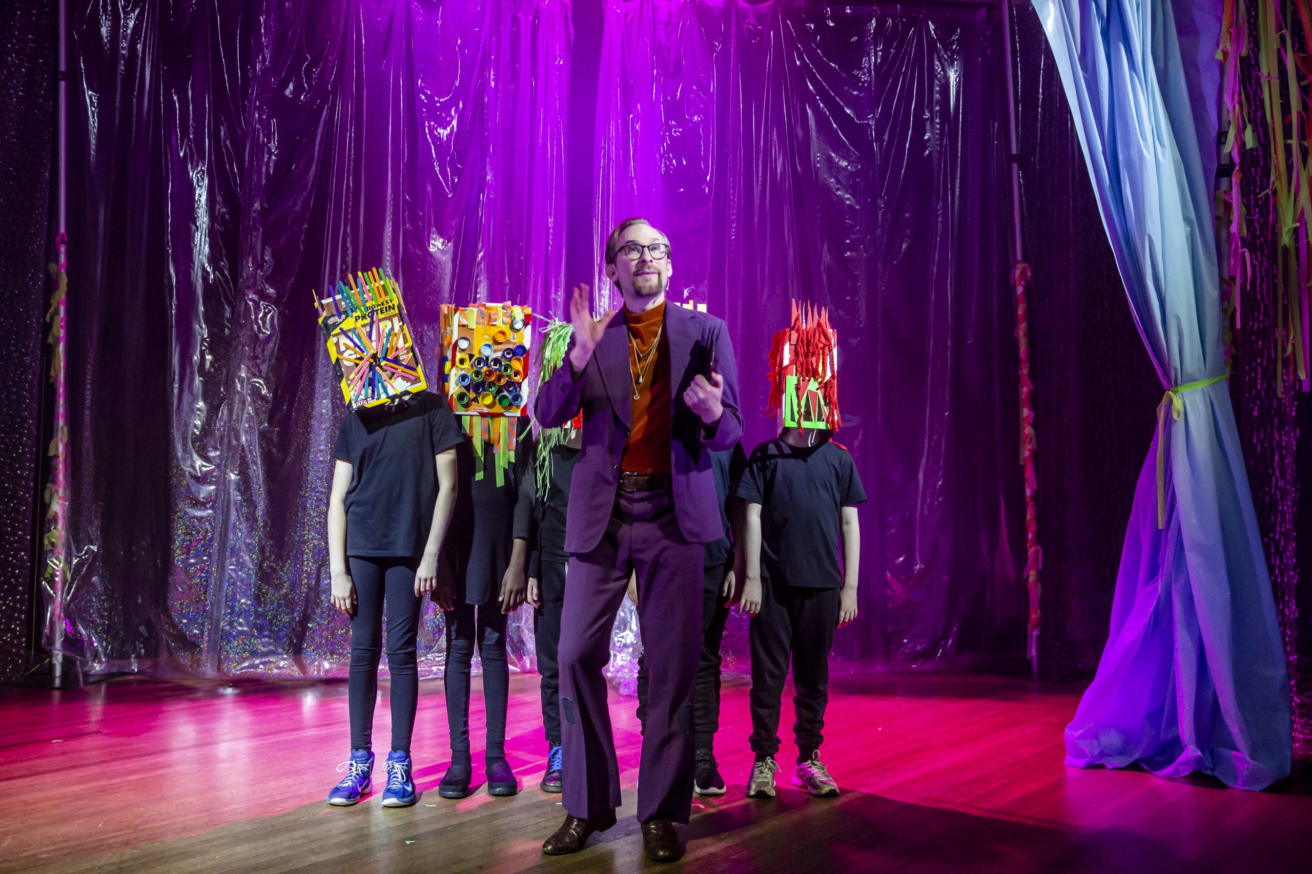 Our rehearsal process consisted of a week-long creative development intensive during the April school holiday period in 2019, followed by a series of rehearsals after school and on weekends in the lead up to the July premiere, which took place at the Northcote Town Hall in Melbourne and ran for a critically acclaimed two–week season. This rehearsal flow is child-centric; it works around children’s availability and a pattern of deep immersion and short engagement. It also requires adult collaborators to be elastic — to expand and contract with the process in a manner that is not always familiar to mainstream rehearsal processes, which usually offer a deep immersion over a period of six to eight weeks. This notion of elasticity, of expanding and contracting within the rehearsal process itself, disrupts dominant power relationships within a collaboration as it decentres adult-centric notions of ‘work’ and replaces them with the more child-centric notion of play. Rehearsal processes that are geared around children’s timelines and designed for children’s maximum participation and enjoyment require adult collaborators to put aside dominant ideas of the process of making a show and embrace a process that expands and contracts with the needs and timeframes of children.