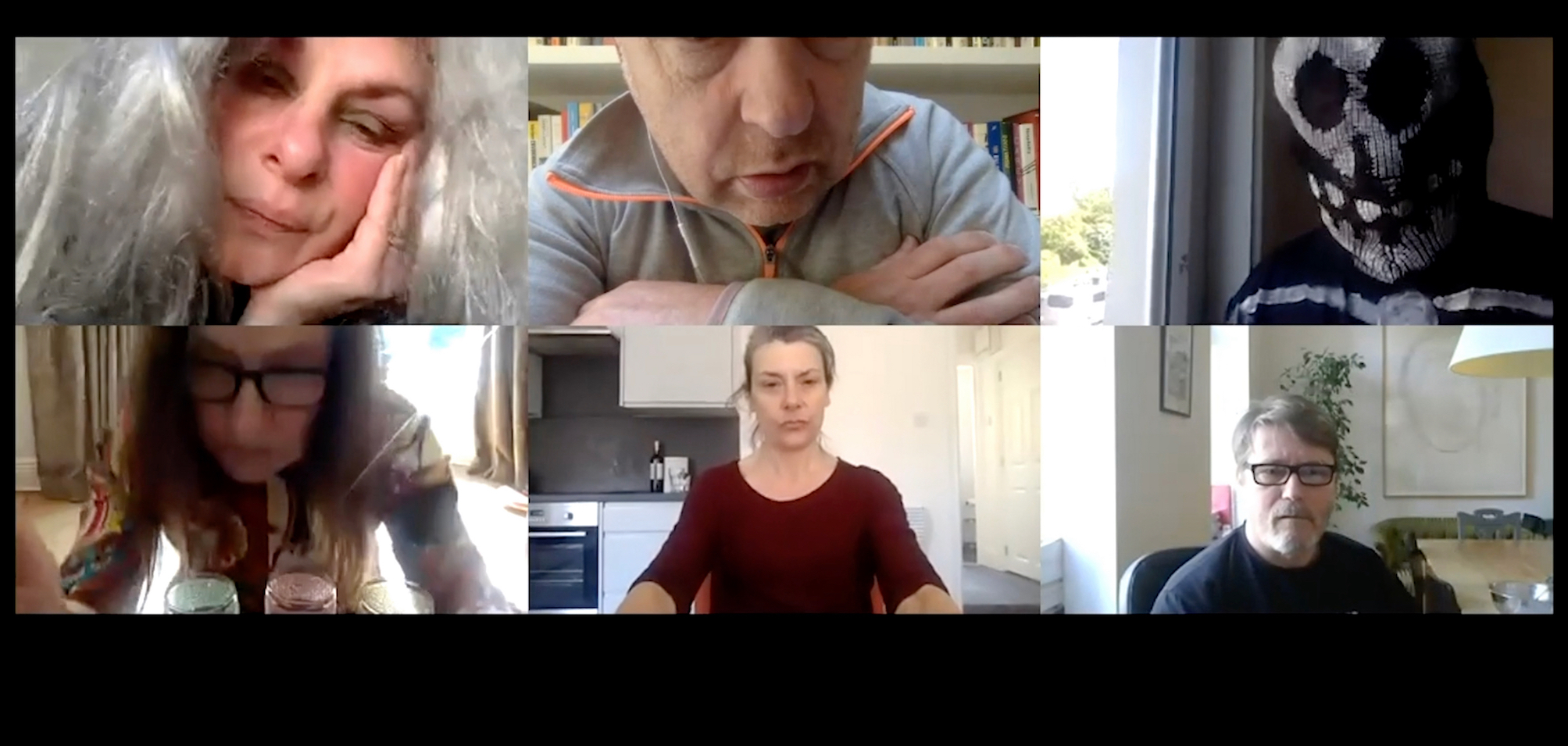 The poignance of End is in its professed failure to say what it wanted to say. Even more, it suggests the failure of theatre — enclosed in Zoom’s environments and cut off from the social milieu outside — to speak meaningfully to the moment. One by one each member of the ensemble exits their frame. Richard, in his skeleton costume, is the last to leave. The meeting continues, leaving six people-less frames recorded by six individual computer cameras connected to Zoom. This non-ending is perhaps a nod to the durational nature of Forced Entertainment’s productions and to the seeming endlessness of the pandemic. More hauntingly, it points to the digital infrastructures that perform, with or without us.