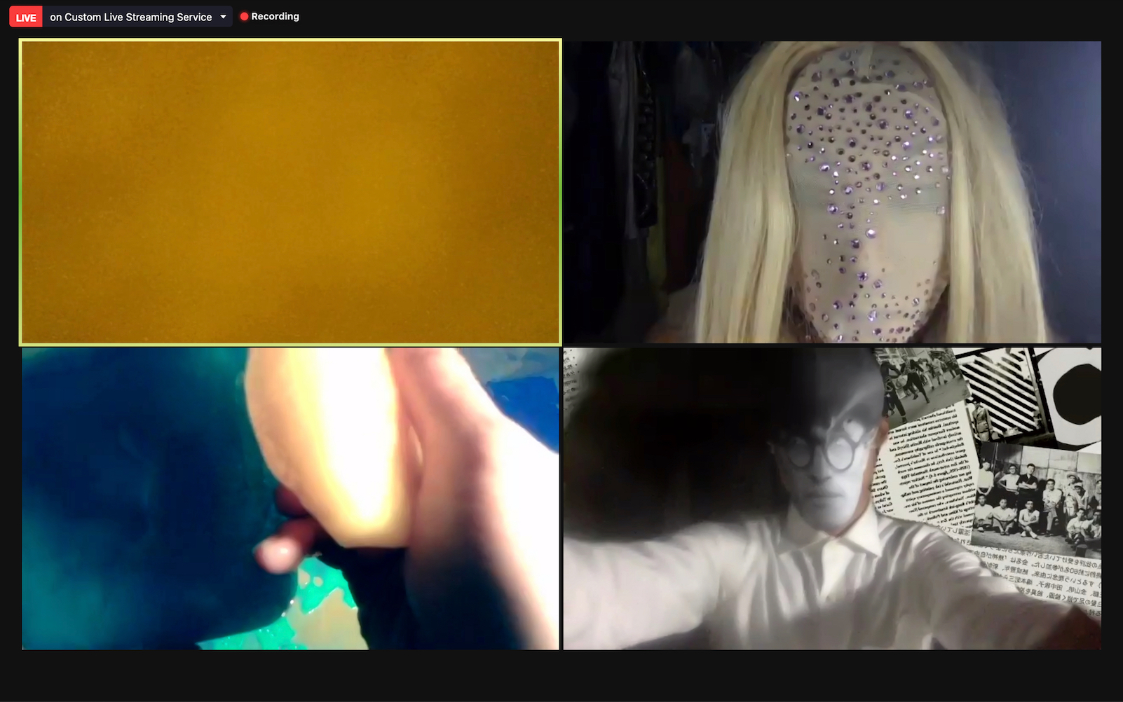 Where Zoom prompts regimented participation and curated self-presentations, Gutai? is emphatically playful in its jostling of theatrically constructed personas that saturate the grid and exceed the limits of the frame. Lin and his cast — who identify as artists, performers, and drag queens — recall Forced Entertainment’s improvisations when they slip in and out of the frame, put on and take off make-up. Each Zoom window in Gutai? is labeled with the name of an iconic Gutai figure; it is never quite clear whether, or when, Lin’s performers are playing a role or playing themselves — or both at once. As in End Meeting for All, we are never quite sure where the performance stops and the “real” communication starts, or where the role ends and the “real” person begins.