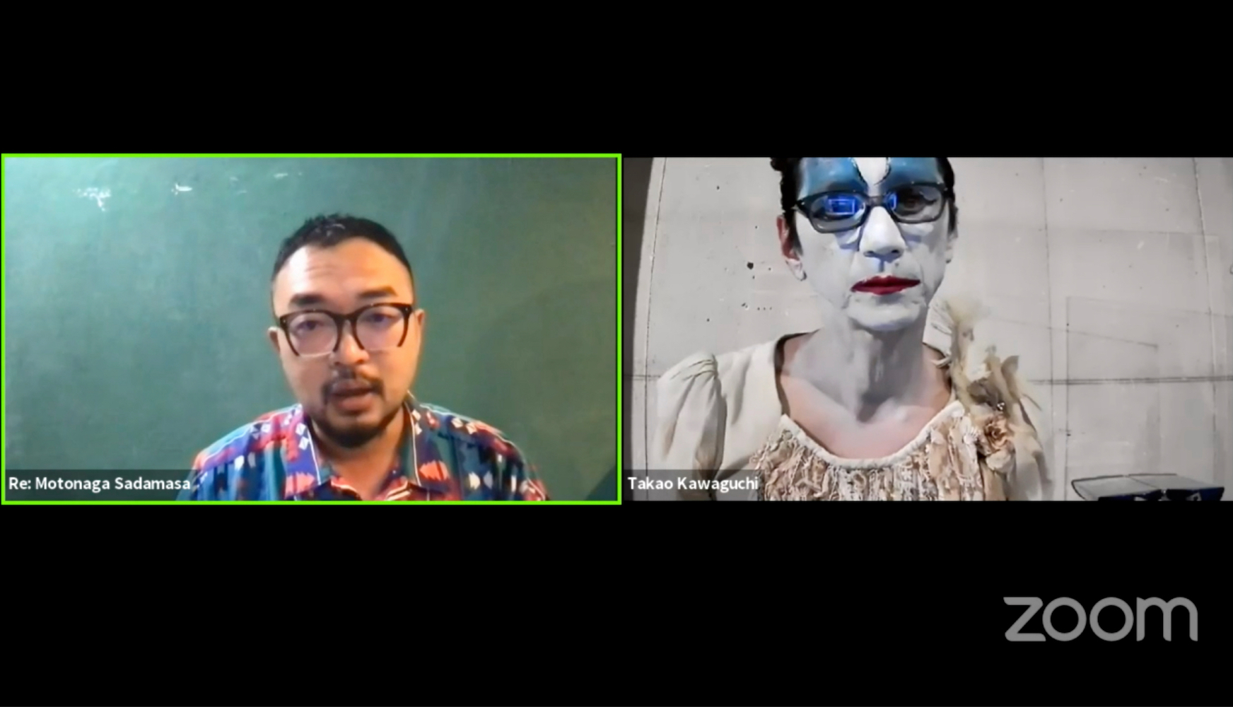 Gutai? seems one response to Benjamin Haber and Daniel Sanders’ call for a “world-building vision for the politics of digitality” that foregrounds queer and feminist experimentation with digital space. They argue that “queer theory and performance studies offer a perhaps uniquely useful framework for encountering the digital, as these fields have long been focused on the contingency of identity, embodiment, and the social.” Likewise, they add, “Digital power and practice, too, offer lessons for queerness, highlighting the marketability of difference and queer cultural forms and the limits of a politics centered on normativity” (Haber and Sanders). Gutai? brings into Zoom’s homogenous, “global” screen environment the diverse “queer sites” (Ramos and Mowlabocus) within which queer subjectivities are constituted. In his conversation with Takao Kawaguchi, Lin (as Motonaga Sadamasa) describes Gutai as a practice of “queering what has been concrete, what has been fixed, what has been written.” He reframes postwar Gutai as a movement of artists who used performance to transform “heteronormative ways of making art.” Lin speaks specifically of a “Taiwanese queerness in the expanded context of Asia” and views his own “queer practice” not as a theory or “approach,” but as an extension of the expanding practices of Taiwan’s democracy.[6] Gutai? thus challenges Zoom’s normalizing environment to suggest there is room within its frames, functions, and networks for diverse localities, where queerness comes into contact and conflict with specific histories and political, cultural, and religious practices.