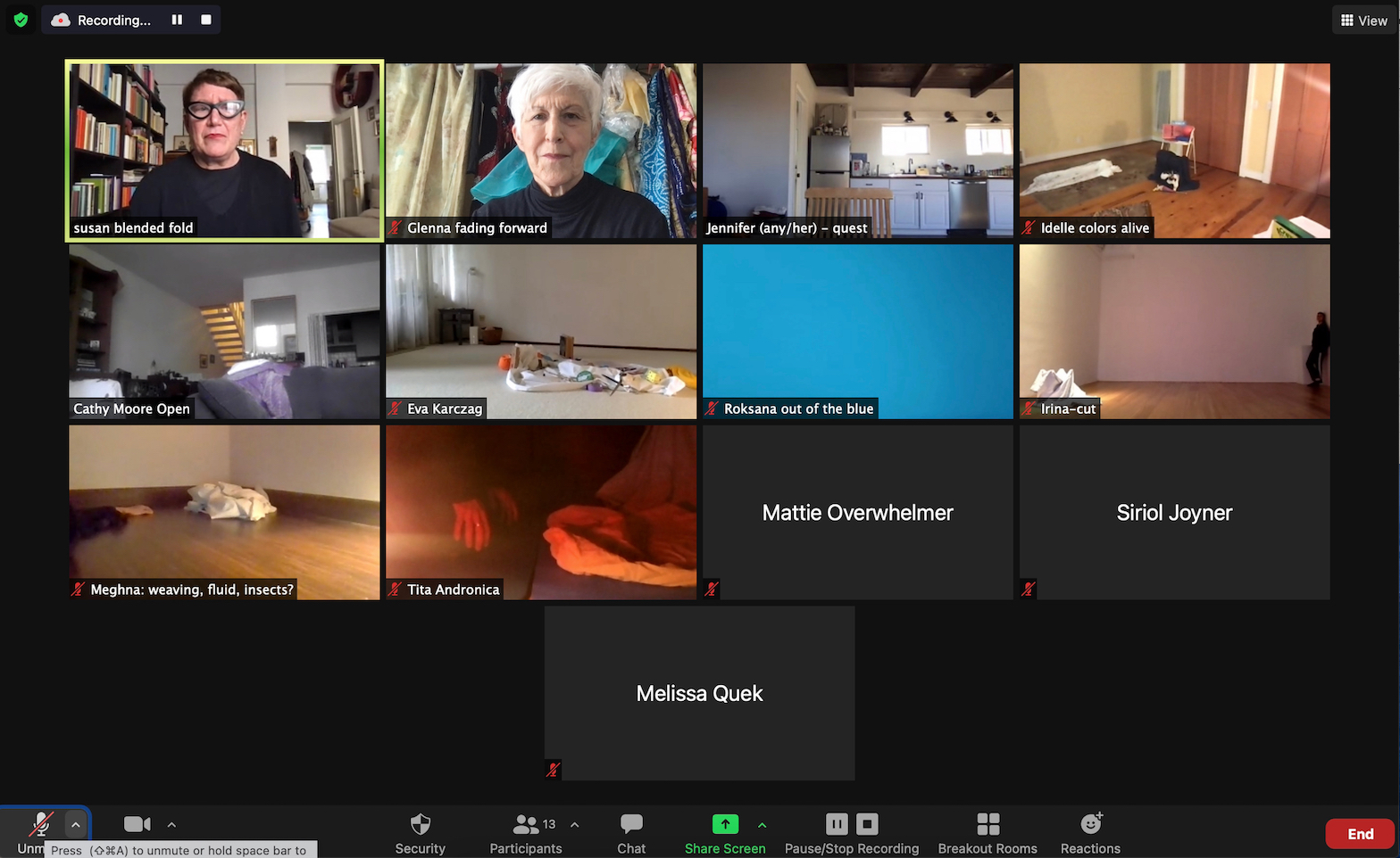 This refiguration begins by expanding the audio-visual field and easing the rigidity of Zoom’s grid. The screen itself is refigured as a shared studio. At the start of each class, participants are invited to orient their gaze and body away from the screen, then guided to dive inwards by closing their eyes or expanding their peripheral vision. Turning away, tuning in, and opening the gaze all challenge the habituated modes of apperception prompted by Zoom. Along with these sensory experiments, the inclusion of participants’ environments — both their physical sites and inner bodily landscapes — become central to the process. Participants are prompted to sculpt and curate their physical space and find objects, props, or texts that might act as sensorial tethers. The grid of frames is thus reconfigured as a theatrical collage of interconnected object-bodyscapes, similar to End and Gutai? These experiments with body, space, and material stretch the confines of Zoom’s audio-visual environment. At other times, the Zoom window is de-prioritized, and participants are encouraged to work and listen in ways that suit their needs; they can turn their cameras or microphones off and work in or outside the frame. At any time during the workshop, the grid of participants may include empty spaces, darkened windows, or the framed view of someone working on their own. Participants are also encouraged to change their names, suggesting a form of role-play not unlike End and Gutai?[8]
