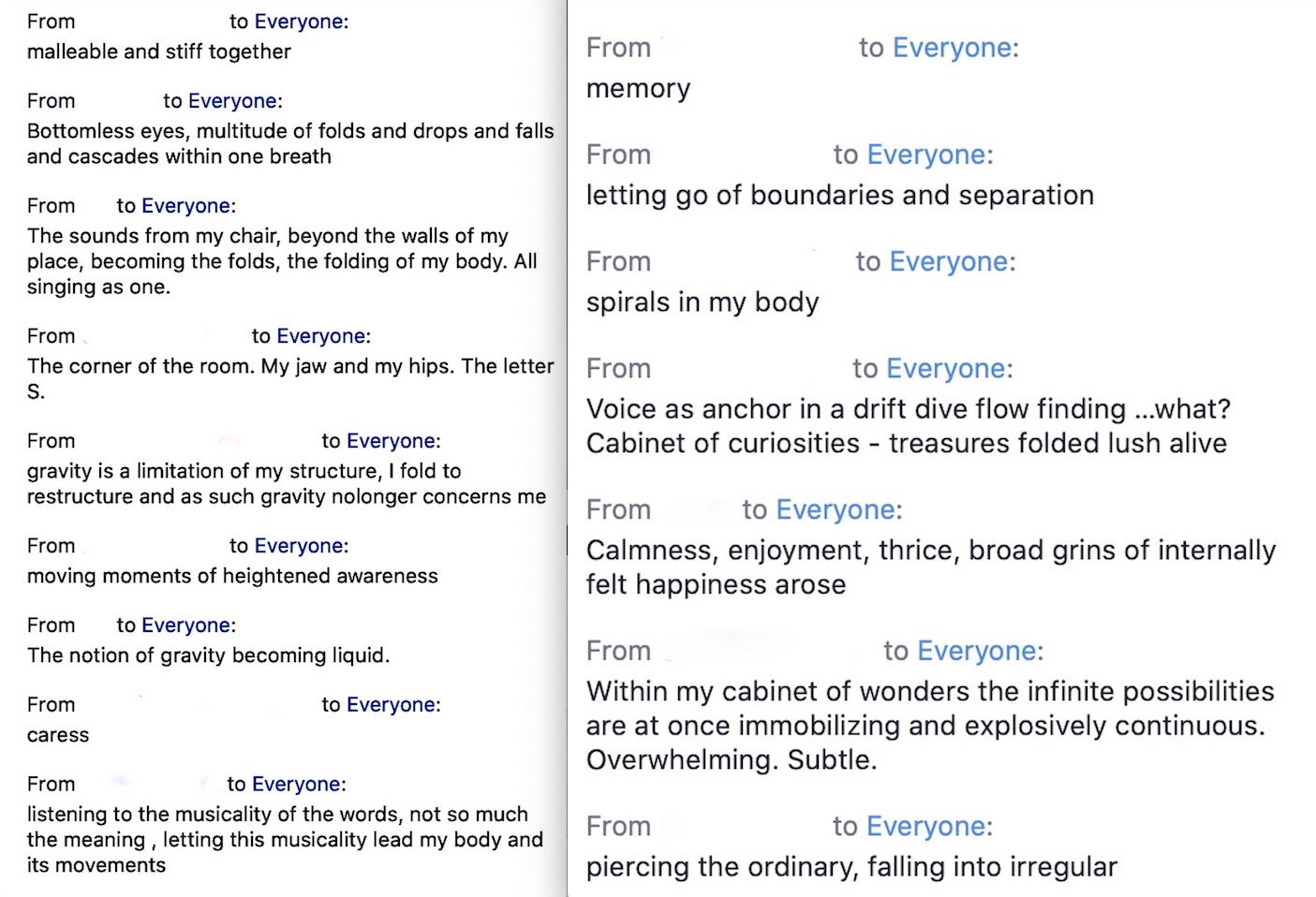 Unlike a typical Zoom meeting, the workshop supports different configurations and durations of participation. Short improvisational dialogues take on a kinetic value, with multiple tones and rhythms emerging as a material. Moments of automatic writing, drawing, or making lead to periods of “harvesting,” where participants hone their explorations. “Scripts” hold participants in their exploratory “dives,” evolving through the facilitators’ continuous “languaging,” but also via notes passed back and forth using Zoom’s chat function. The chat is not only a site to pose questions and comments, but a place to generate the words necessary to the process. A to-and-fro of reflection produces a poetic amalgam of vocabulary that resists ascription as indexical content. The work is composed as a continuous co-creation, a “feed-forward mechanism for lines of creative process” that yields what Erin Manning defines as an “anarchive,” — “a repertory of traces of collaborative research-creation events” (“Anarchive”).